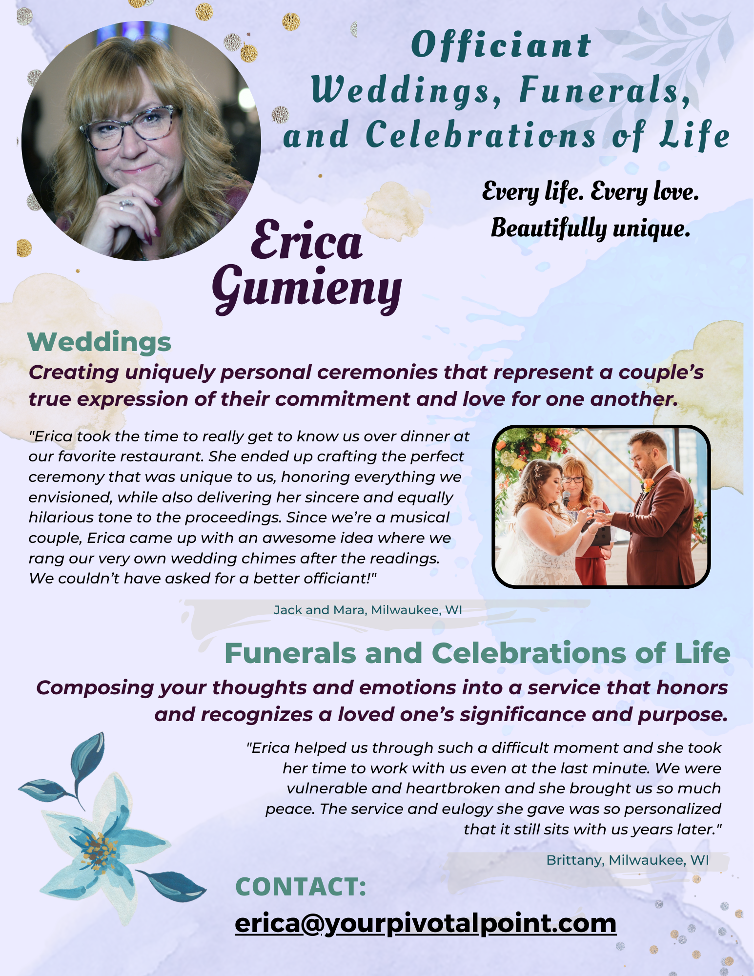 Whether we’re celebrating a commitment or honoring a life well lived, I take the time to listen, learn your story, and craft words that bring comfort, connection, and meaning to the moments that matter most.